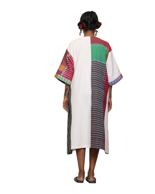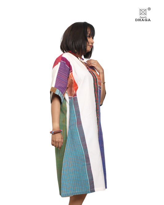 Handloom white cotton & multicolor gamcha patchwork free size dress with pockes- KD04