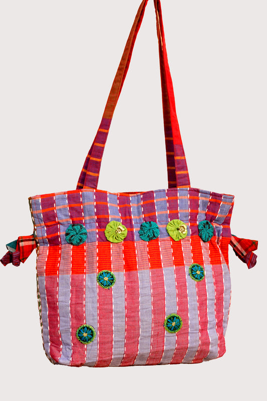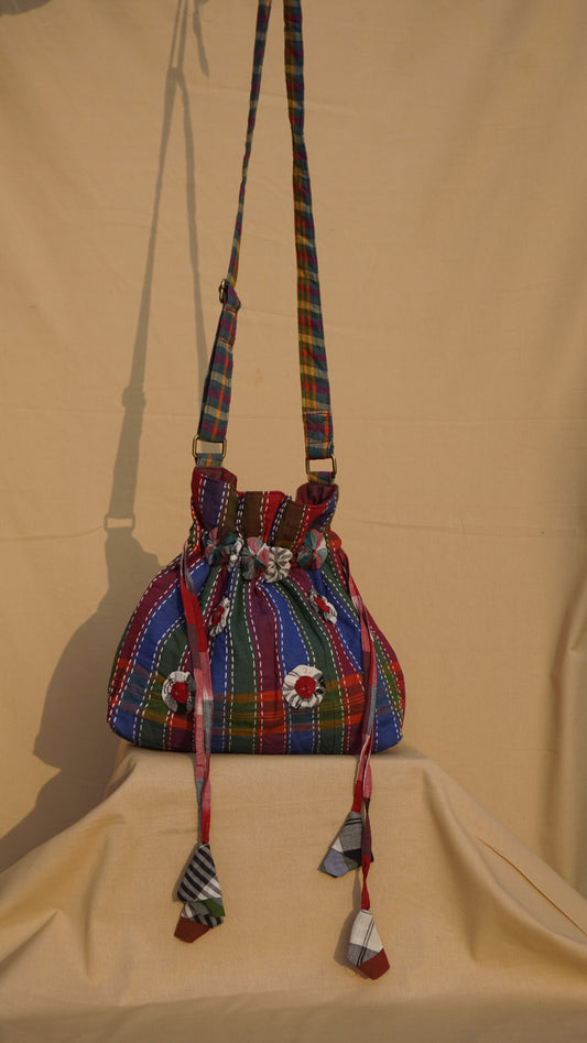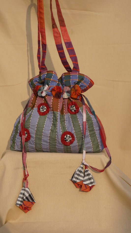 Handcrafted Gamcha Potli Shoulder Bag with Kantha Hand Embroidery & Drawstring Closure | Rangila Dhaga Bag28