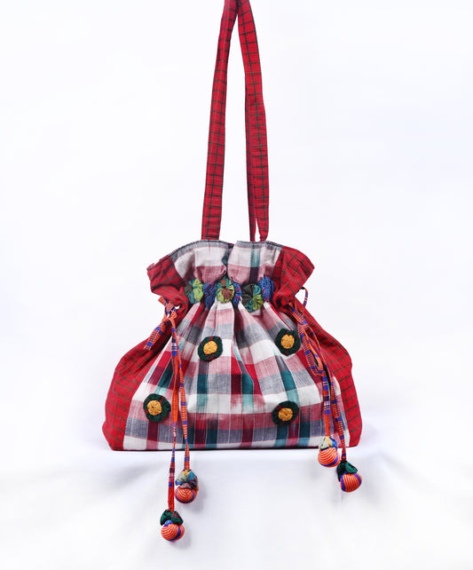 Potli Bag Female Gamcha Fashion Handloom Fabric Red PT1