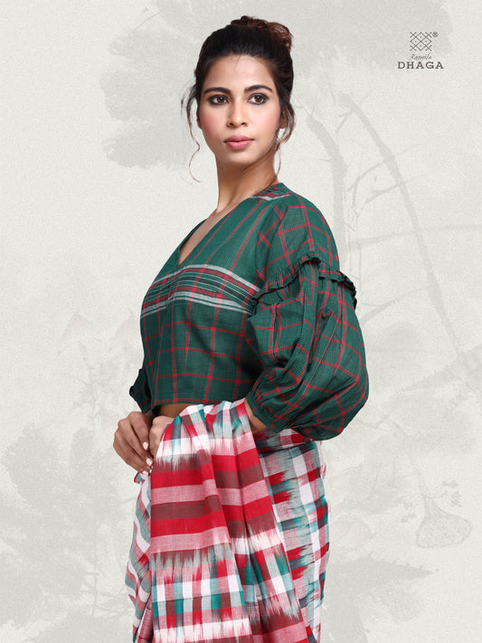 Blouse Gamcha Fashion Handloom Cotton Fabric with Bishop (Caff) Sleeves Dark Green BL5