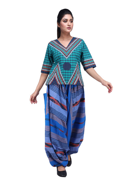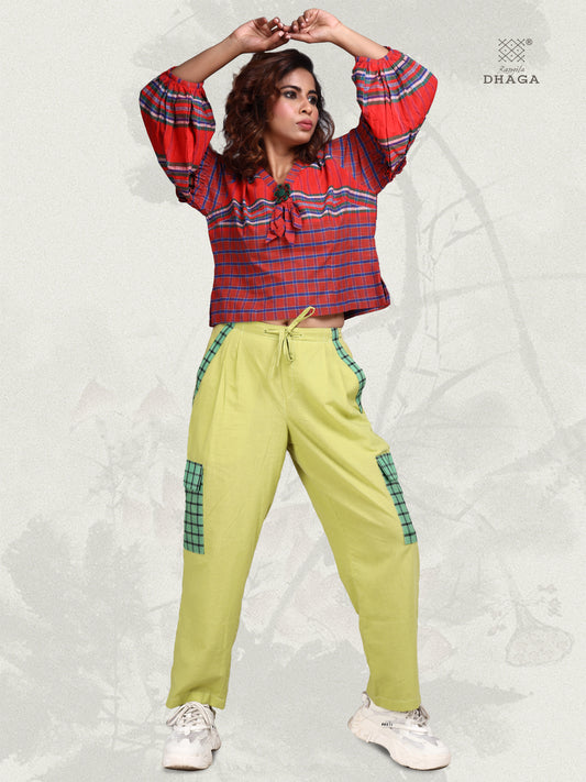 Tunic Crop Top Gamcha Fashion Handloom Cotton Fabric with Bishop (Caff) Sleeves (Top7)