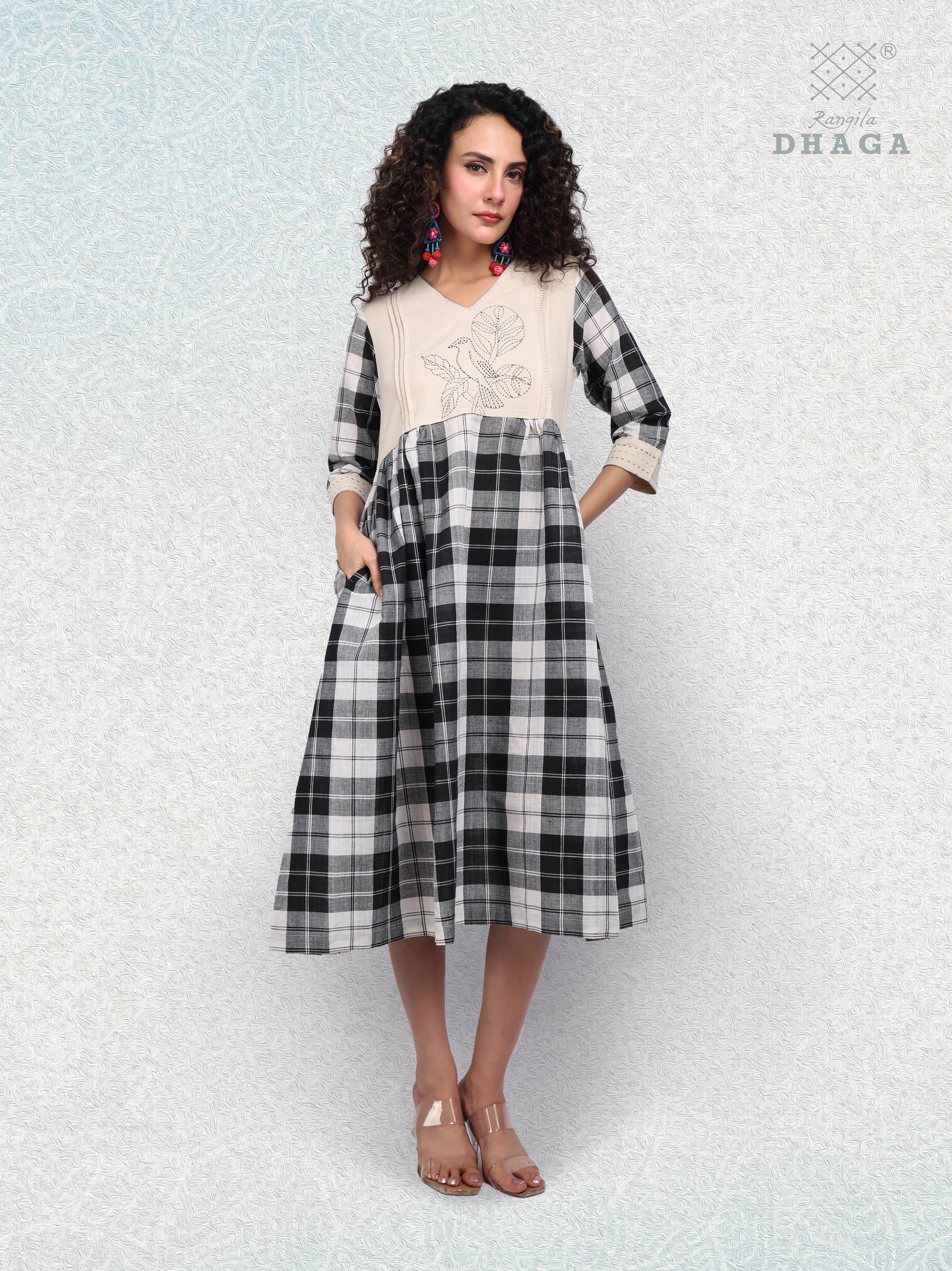 Simple, elegant, and rooted in craft — this black and white handloom cotton dress features bold checks paired with a soft beige yoke, delicately hand-embroidered with a bird and leaf motif. The A-line silhouette is airy and flattering, while side pockets add comfort and functionality.
