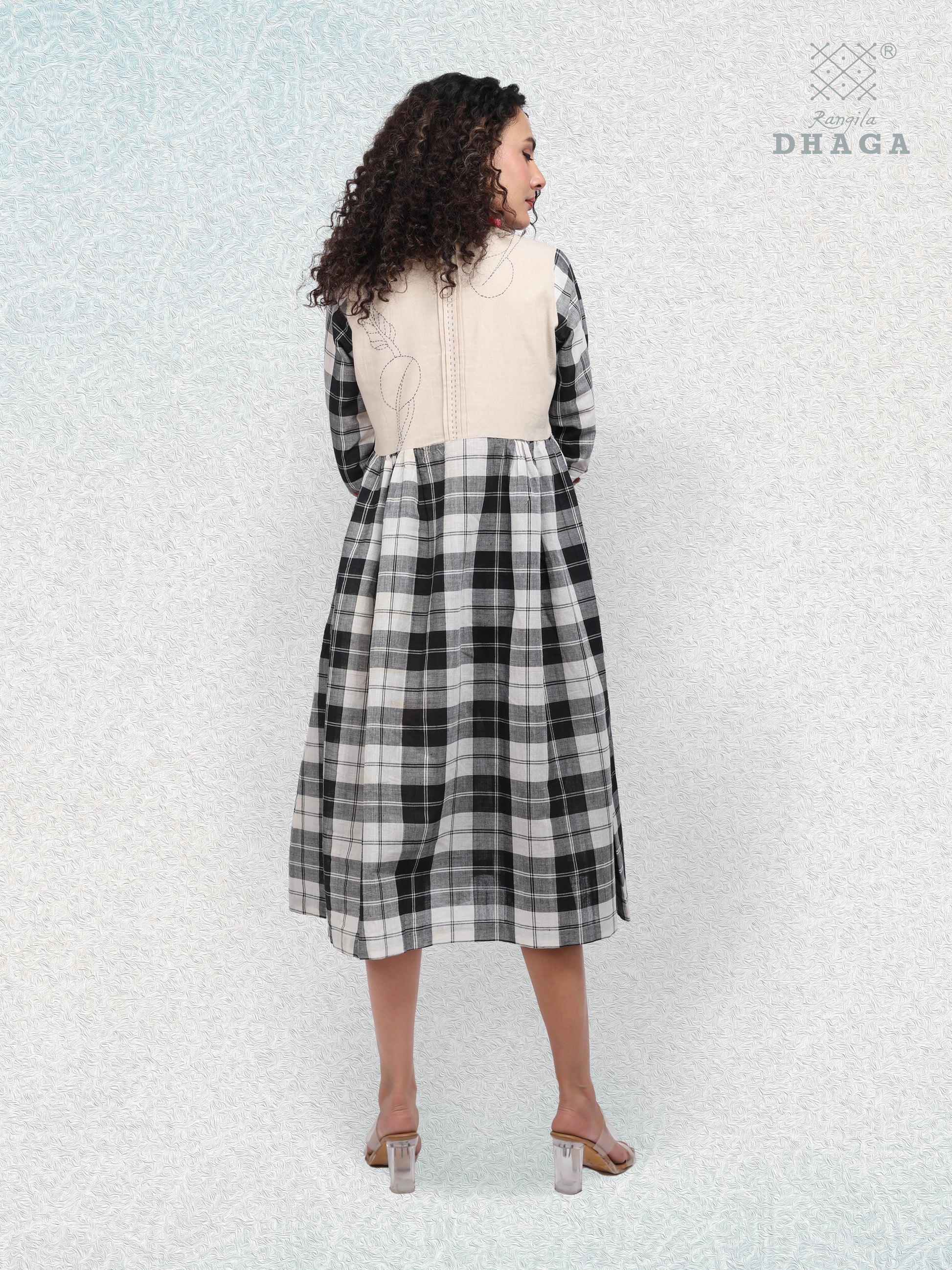 Colors: Monochrome black & white checks with beige embroidered yoke